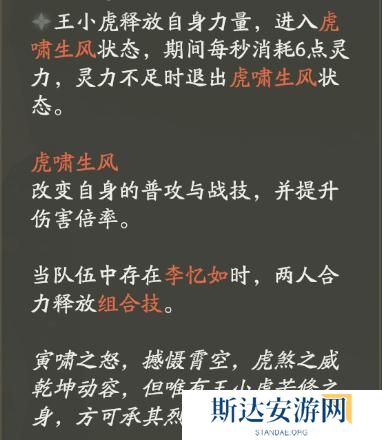 释放自身力量进入虎啸生风状态,每秒消耗6点灵力(灵力不足时退出)。此状态下普攻与战技形态改变,伤害倍率提升,且可与李忆如触发组合技。