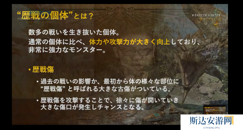 首先,将会出现《怪物猎人 世界》中的历战个体。与普通怪物相比,历战怪物的体力和攻击力都有明显提升。不过在这部作品中,历战怪物会有历战伤痕,玩家攻击这些伤痕可以逐渐扩大伤口,最终造成非常大的伤口,从而创造良好的进攻时机。