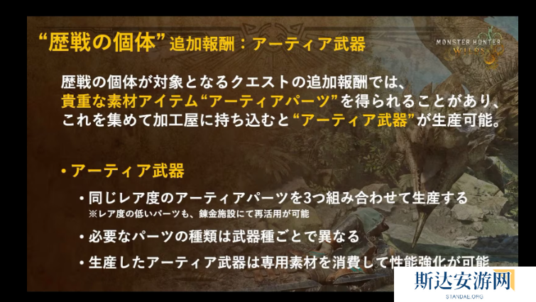 击败历战个体后能够获得Artia(暂译:阿提亚)素材和装饰品。