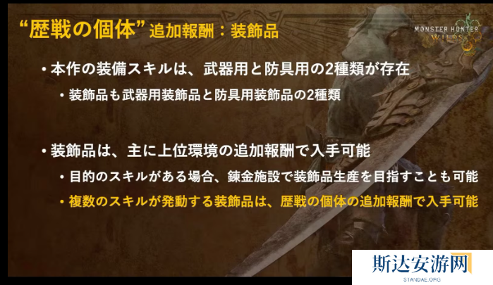 装饰品在本作中分为武器用和防具用,主要通过高级的追加奖励获得,也可以通过炼金系统洗出特定技能。而历战个体有可能掉落具备多个技能的装饰品。