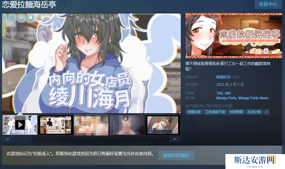 由日本社团“TAIL-AKI”去年在DLsite推出的热门绅士恋爱模拟游戏《恋爱拉面海岳亭》,经过芒果派对的代理,今天在Steam上发布了繁体中文的***版,受到了好评。