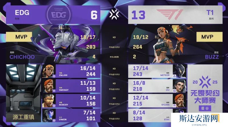 第二张地图源工重镇,EDG 6:13 T1,MVP给到了BuZz选手。