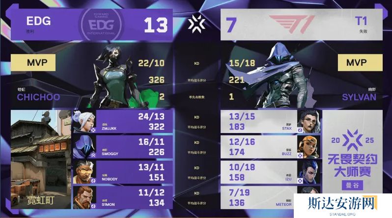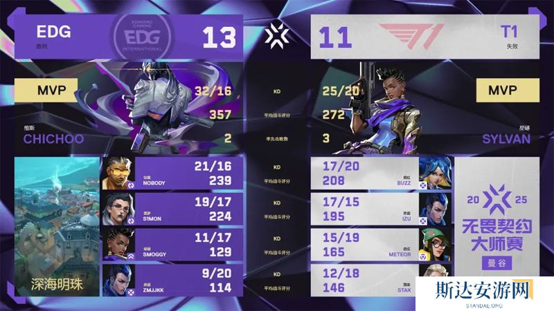 2025 VCT 曼谷大师赛,淘汰赛首轮,CN联赛一号种子EDG对阵太平洋联赛二号种子T1,双方战满三图,最终EDG在决胜图劣势的情况下,凭借球球的救世主发挥拿下了比赛,挺进胜者组决赛。