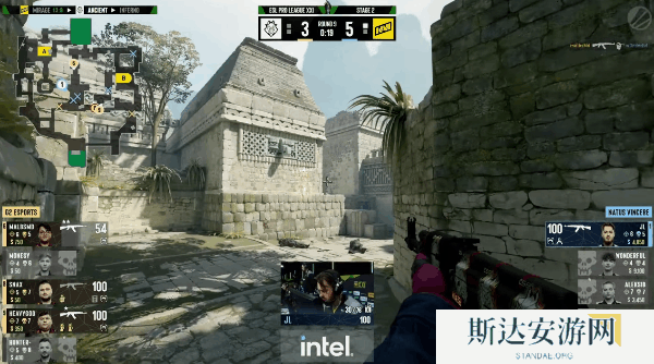 图一为G2选择的Ancient,进攻方开局的G2选择封1、2道烟强打B区,获得人数优势后成功拿下手枪局。长枪局的G2选择控中后换人头,吸引对手放手阵型后成功进入B区下包,比分来到3-0。下一回合半起的NAVI在中路手枪发挥,建立人数优势后成功翻盘。翻盘后的NAVI成功抵挡住了对手的两波B区快提,成功将比分反超至5-3。第九回合G2重新开始控制中路,通过补枪建立了巨大人数优势并清空B区。但思考过多的G2在此时选择了转A,jL在关键时候的甜甜圈出击拿下1v3残局将比分继续扩大,双方战至7-3。