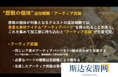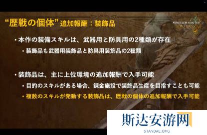 击败历战怪物后,玩家可获得珍贵的Artia(暂译:阿提亚)素材和装饰品。其中,阿提亚素材可用于制造强大的阿提亚武器,而装饰品则分为武器用和防具用,可通过链金系统洗出特定技能。此外,历战怪物还有可能掉落具备多重技能的高级装饰品。