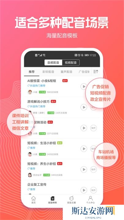 3、提供政企宣传、商业广告、彩铃等多种配音场景模板。