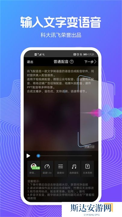 1、利用讯飞自主技术,迅速将文字转化为自然流畅的语音。