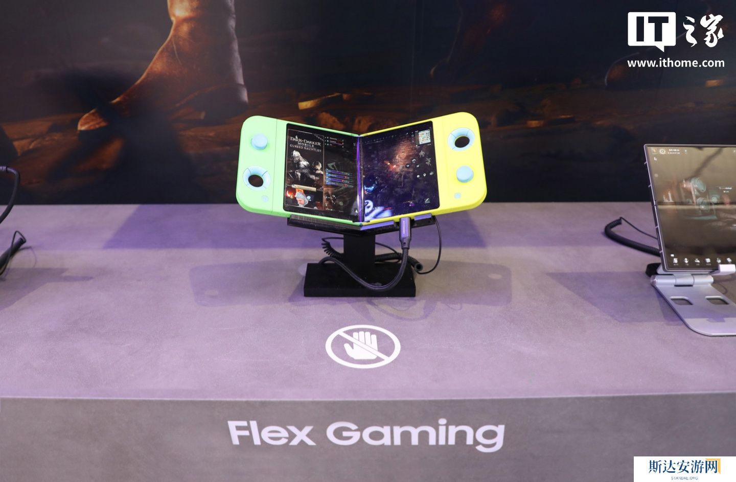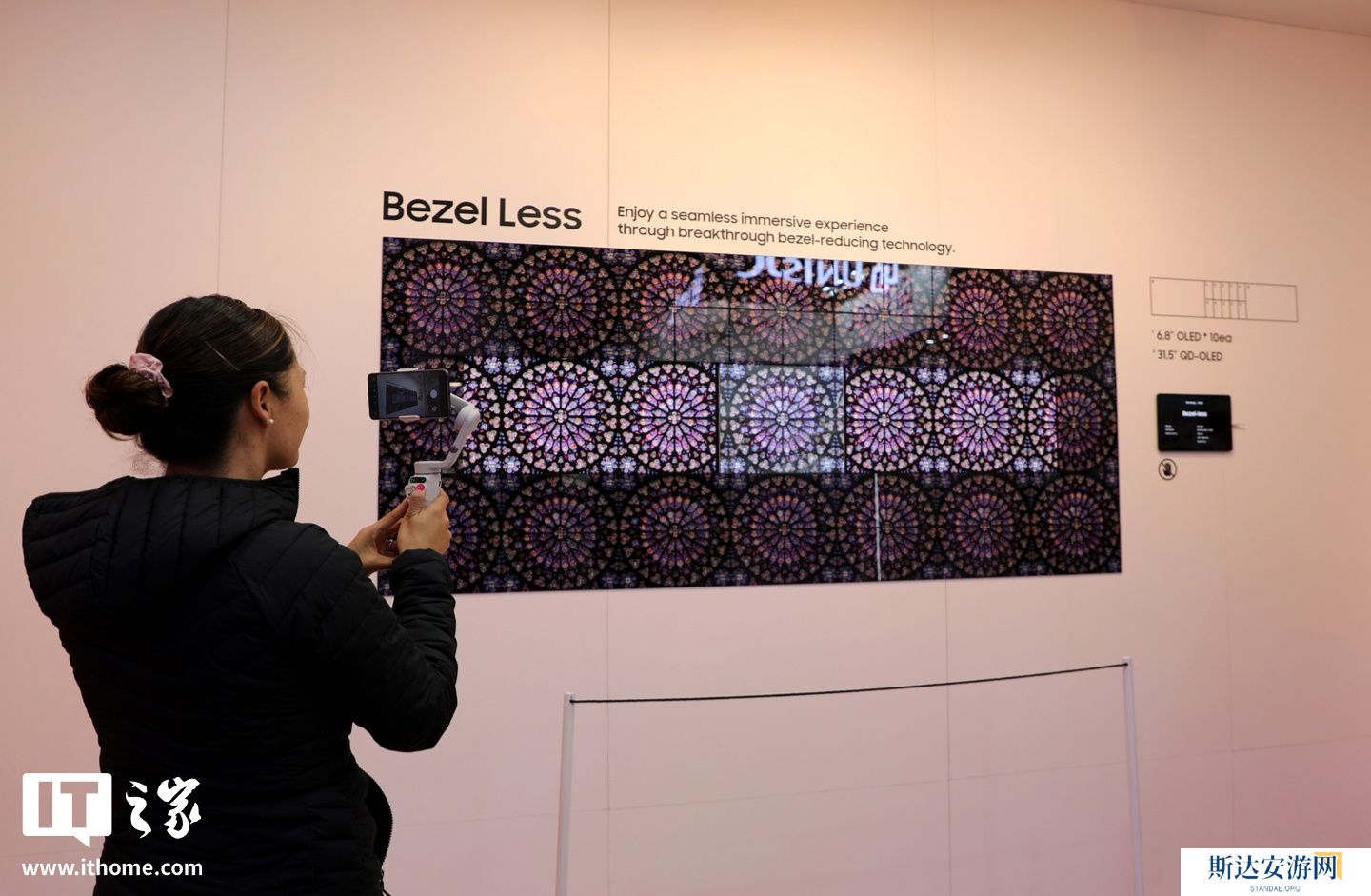 在柔性和无边框 OLED 技术方面,三星带来了三款引人注目的概念产品。其中包括一款可完全弯曲的三星“柔性游戏”掌机、一款总屏幕尺寸为 18.1 英寸的“柔性机舱包”可折叠 OLED 公文包,以及通过将十个 6.8 英寸的 OLED 面板拼接在一起形成的无边框“OLED 瓷砖”,共同构成一个单一显示屏。