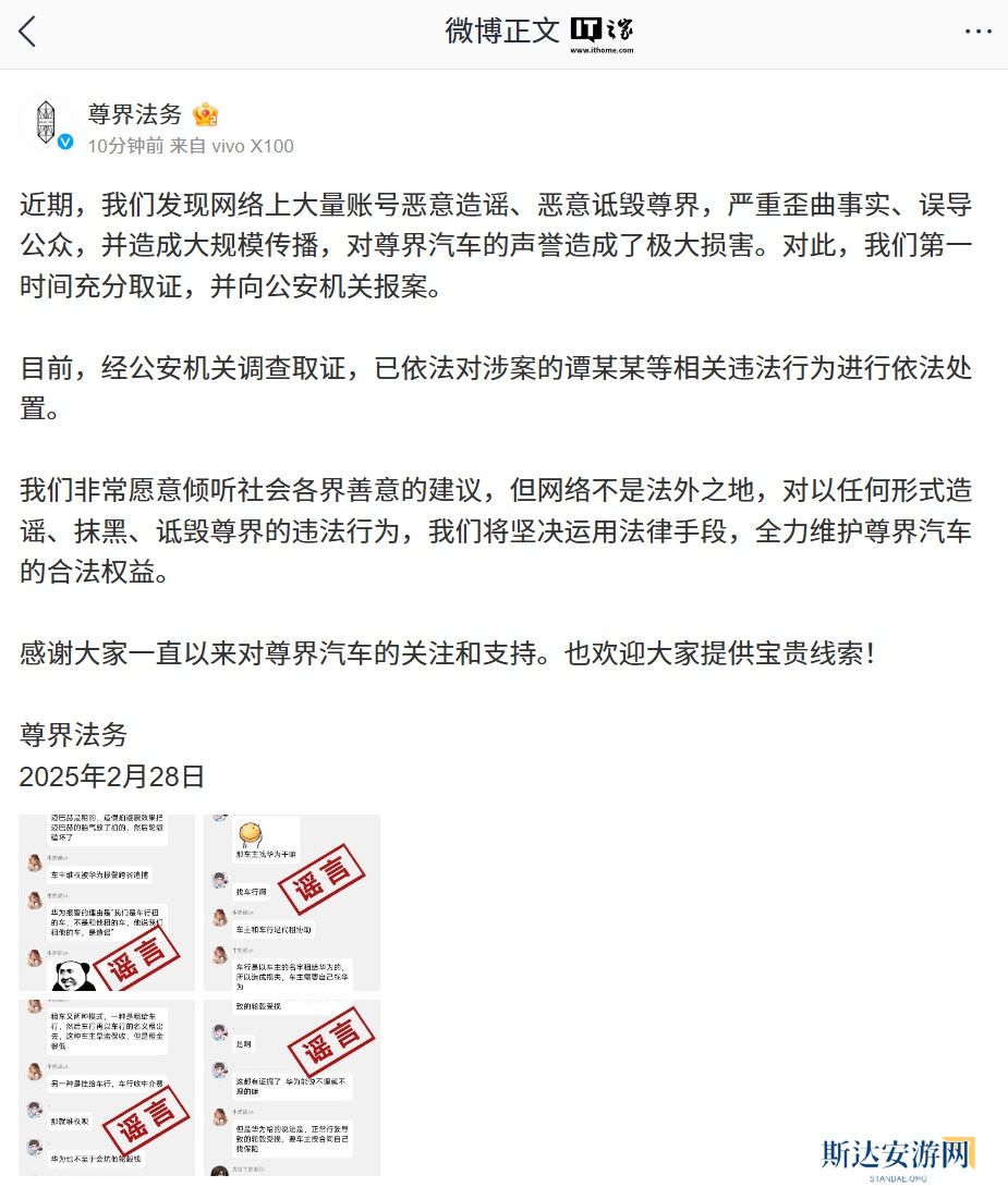 本站 2 月 28 日消息,尊界汽车法务官方微博今日发文称,近期,我们发现网络上大量账号恶意造谣、恶意诋毁尊界,严重歪曲事实、误导公众,并造成大规模传播,对尊界汽车的声誉造成了极大损害。尊界法务表示,目前,经公安机关调查取证,已依法对涉案的谭某某等相关违法行为进行处置。