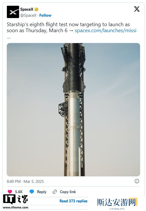 本站 3 月 5 日消息,SpaceX 宣布星舰(Starship)第八次飞行测试已确定新的目标日期,计划于当地时间 3 月 6 日进行,发射窗口将在中部时间下午 5:30 开启(本站注:北京时间 3 月 7 日 7:30)。