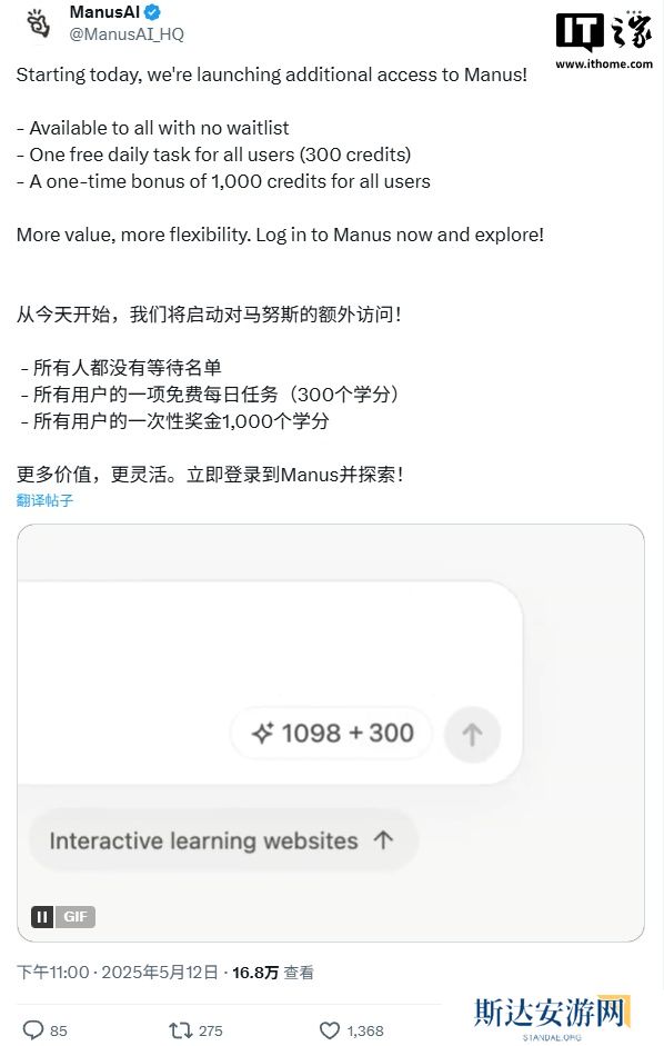 Manus 在公告中表示,Manus 即日起面向所有人开放,无需等待;所有用户每天可免费执行一项任务(300 积分),新用户可额外获得 1000 积分的一次性奖励
