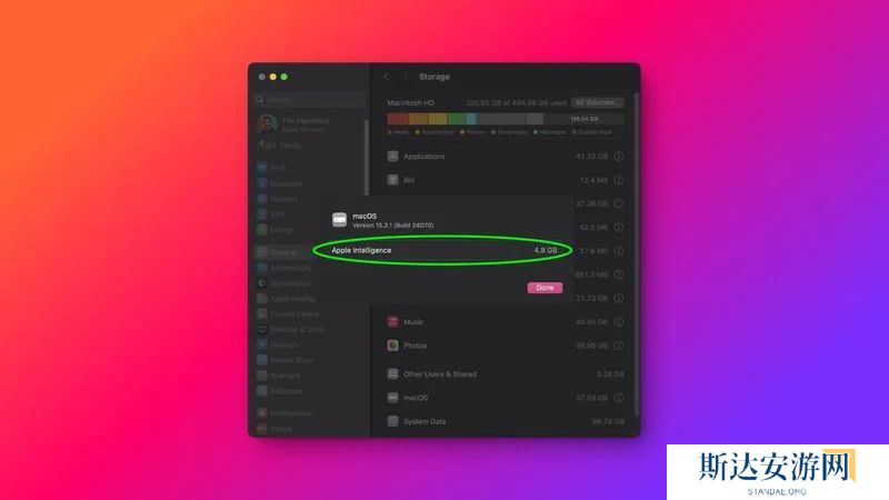 在 macOS Sequoia 15.3.1 版本中,用户可以通过系统设置 ➝ 通用 ➝ 存储,点击“i”按钮查看 Apple Intelligence 功能占用的存储空间。然而,自 macOS 15.4 Beta 2 发布后,苹果移除该功能,用户无法再获取相关存储信息。
