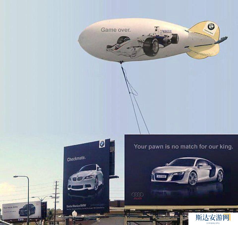 当宝马租用飞艇带着“游戏结束”标语掠过战场时,奥迪再度亮出 R8 广告:“该换标了,你的豪华认证可能已过期。”这场持续数月的创意交锋最终由宝马主动休战画上句号。