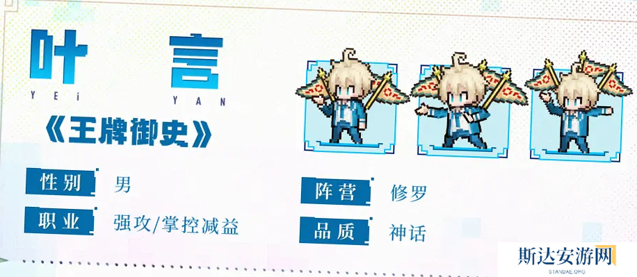 叶言的技能组决定了他并非单体爆发型角色,更加倾向于通过给敌方施加多种debuff来限制敌方输出,独有的掌控机制有很大概率能够限制敌方单体输出,同时掐心算点技能可以进一步提高我方开局的输出,综合来看,叶言是一名综合型角色,非常适合搅乱敌方进攻节奏。