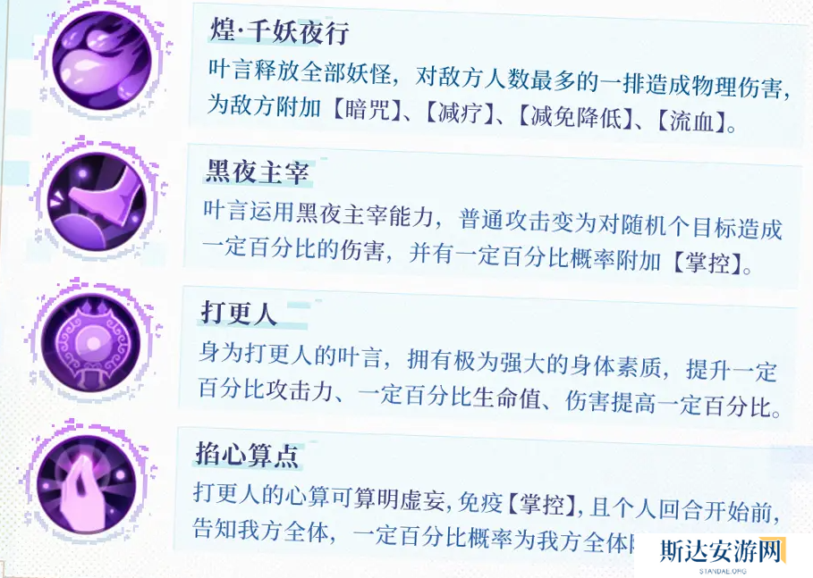 叶言释放全部妖怪,对敌方人数最多的一排造成物理伤害为敌方附加【暗咒】、【减疗】、【减免降低】、【流血】。