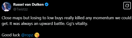 Twistzz:比分虽然接近,但输给对手的经济劣势局确实扼杀了我们可能建立的任何势头。这始终是一场艰难的战斗。GG Vitality。