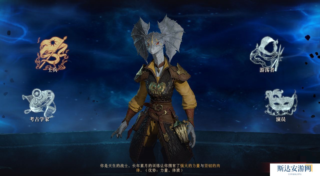 目前游戏内主要的身份只有四种,考古学家和士兵,游荡者和演员,每种身份带来的属性优势都不尽相同。考古学家的属性优势主要体现在脑力方面,感知和智力这两个属性上会有一定程度的提升。