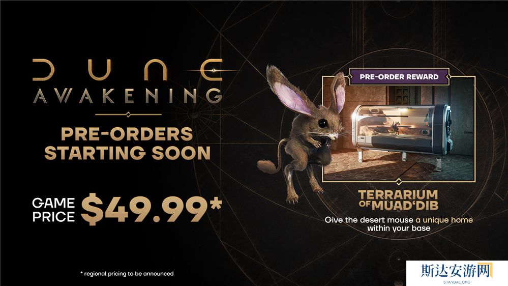 定价方面,游戏基础版定价49.99美元,即将开放预购。预购玩家将获赠"穆阿迪布生态箱"(Terrarium of Muad’Dib)——一件可安置标志性沙漠鼠的基地装饰品。仔细观察这只沙漠智者的生活习性,它将传授你在严酷沙海中的生存智慧。
