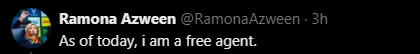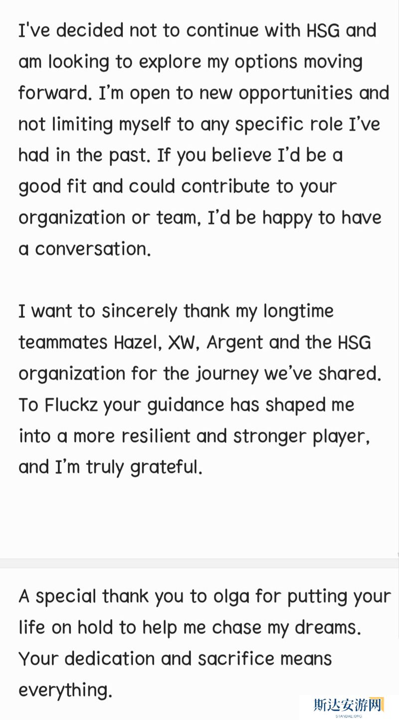 “我决定不再继续与HSG合作,并希望探索未来的选择。我对新的机会持开放态度,并不局限于我过去担任的任何特定角色。如果你认为我适合并能为你的俱乐部或团队做出贡献,我很乐意进行交流。