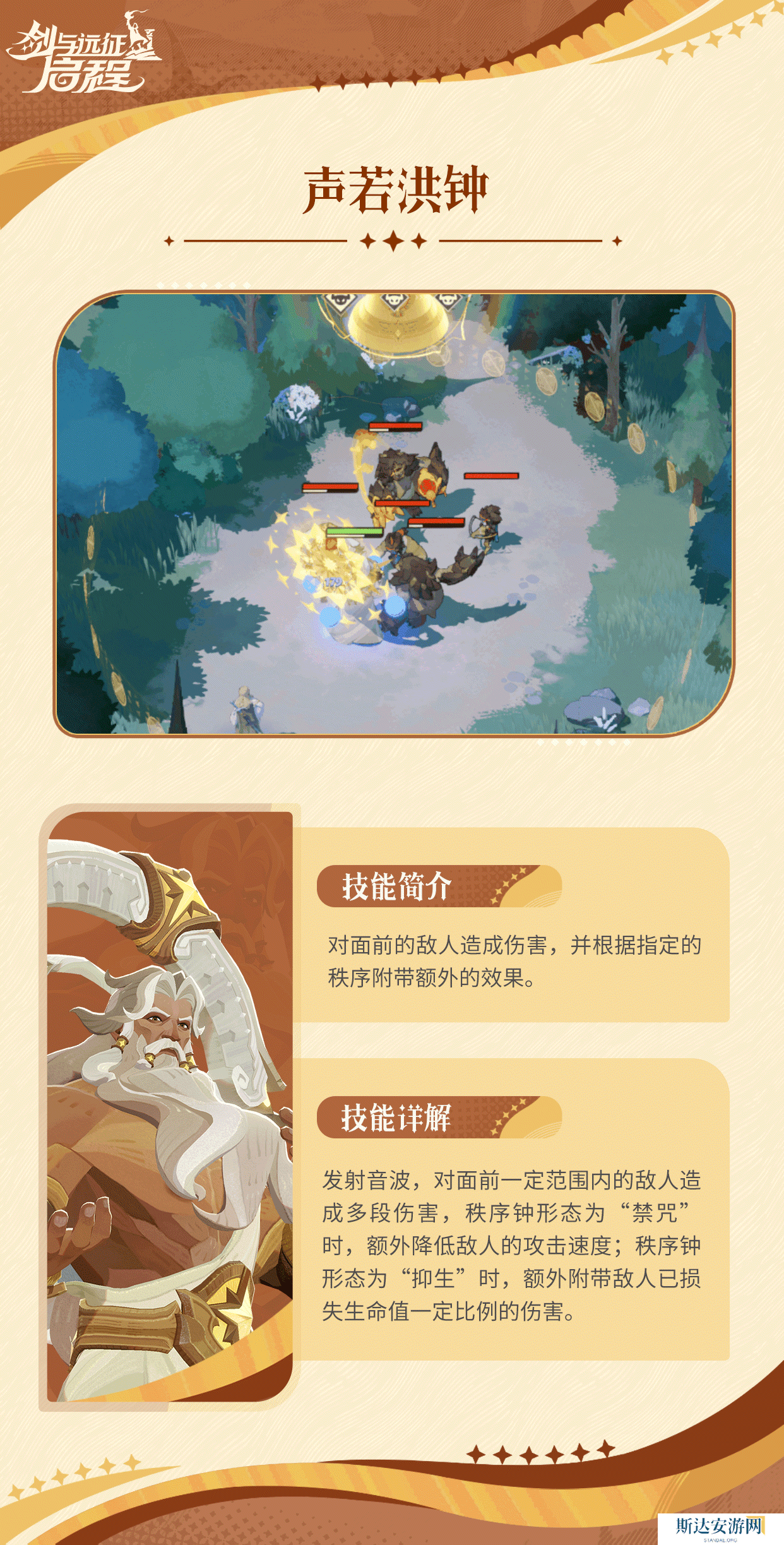 技能效果:发射音波,对面前的敌人造成多段伤害。当秩序钟处于“禁咒”形态时,音波还会降低敌人的攻击速度;在“抑生”形态时,音波会额外造成基于敌人已损失生命值的伤害。