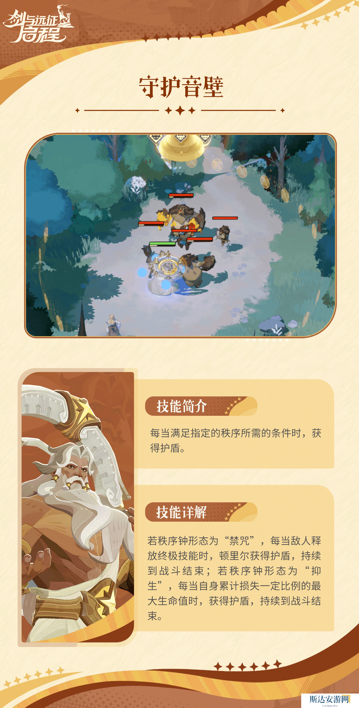 技能效果:当敌人释放终极技能时,若钟声处于“禁咒”形态,顿里尔将获得持续至战斗结束的护盾;若钟声处于“抑生”形态,每当顿里尔受到一定伤害时,他将获得同样的护盾。