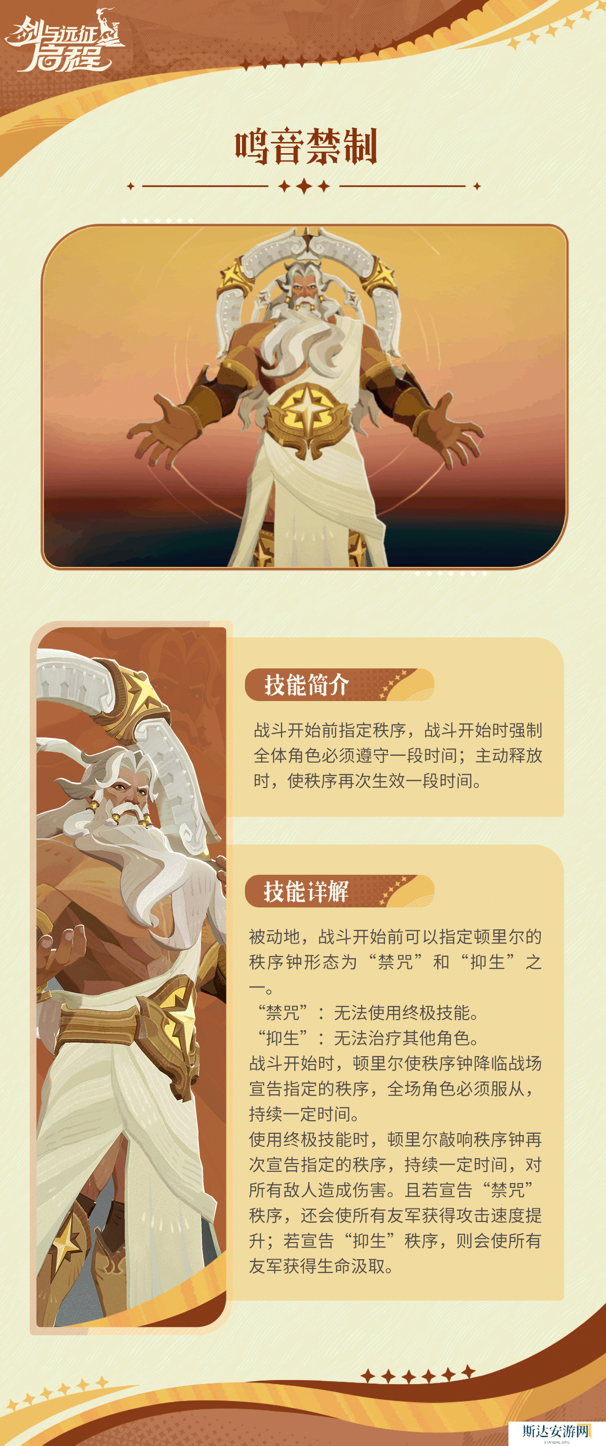 技能效果:召唤秩序钟降临战场,宣告特定的秩序。全场角色在持续时间内必须遵守,“禁咒”形态下所有角色无法使用终极技能;“抑生”形态下所有角色无法对其他单位进行治疗。每次主动释放该技能时,会敲响秩序钟再次宣告并施加指定的秩序,持续一段时间,同时对所有敌人造成伤害。