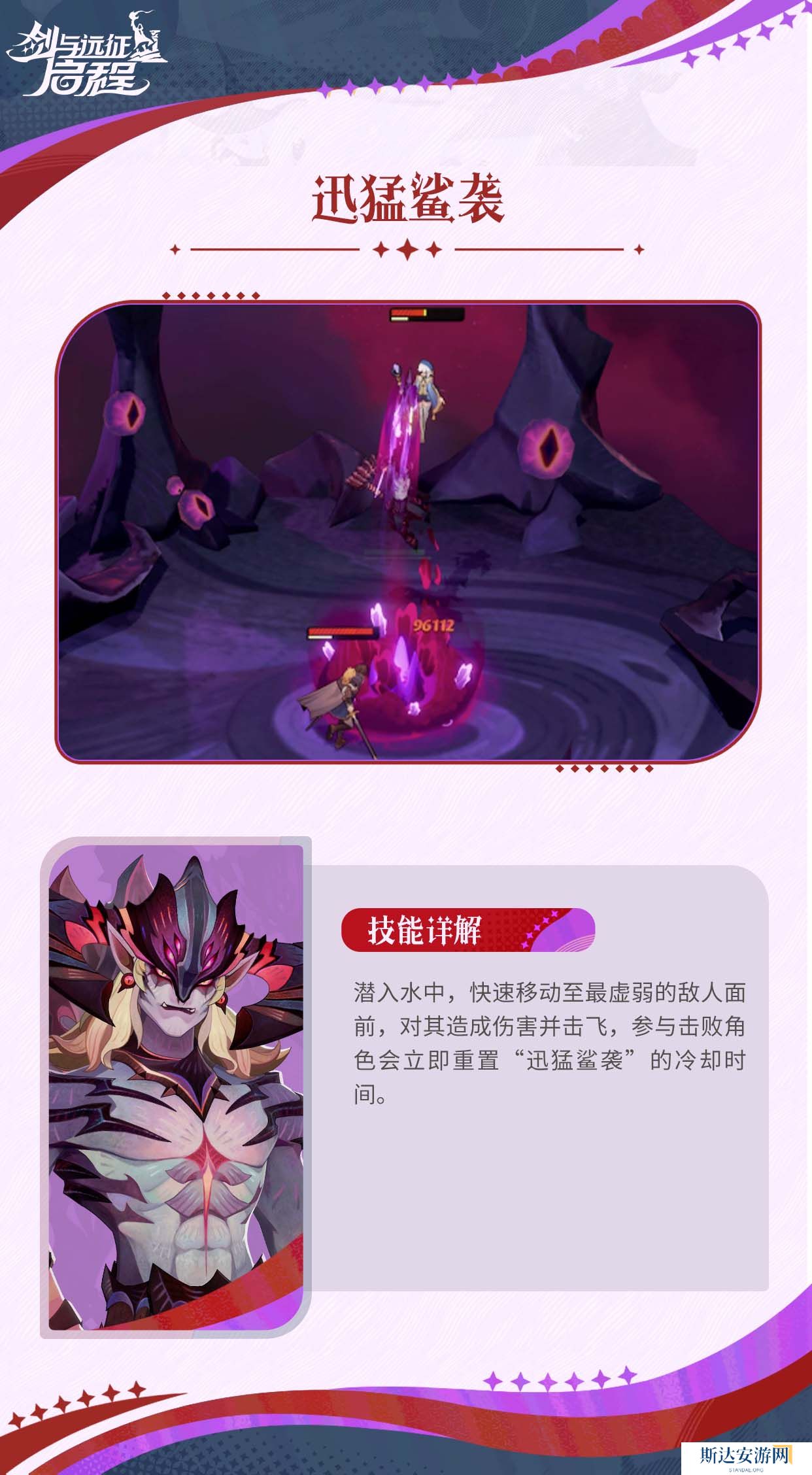迅猛鲨袭:这是一个突进技能,能够对敌方后排造成巨大威胁和一定控制效果,且在水中处于无敌状态。参与击败敌人会立即重置冷却时间。该技能使哈拉克成为一个对敌人输出核心威胁极大的突进类角色,并且无敌和击杀刷新的机制也极大提高了他的生存能力。