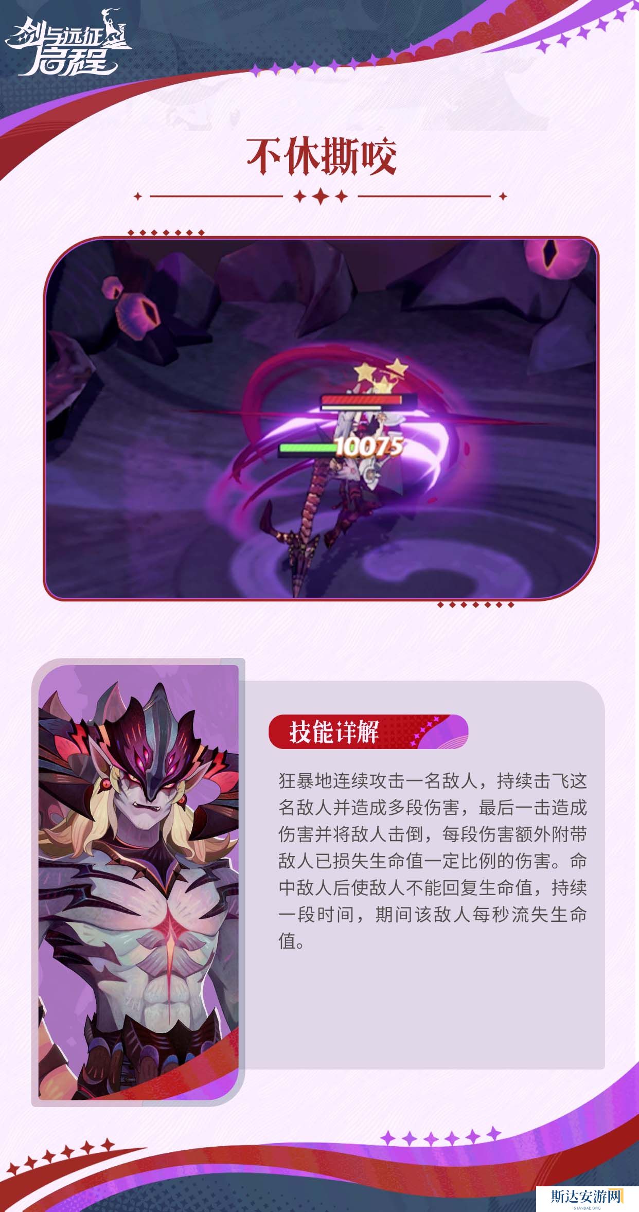 不休撕咬:持续攻击单体敌人造成巨额伤害并且附加持续控制,技能释放期间自身附带霸体状态,单体禁疗效果,流血效果和已损生命值伤害(BUFF叠满了)。这一技能让哈拉克在PVP中对敌方后排阵容有很强的切入和收割能力,奠定了他在推图中面对死潮的地位和迷梦中快速出伤的能力。