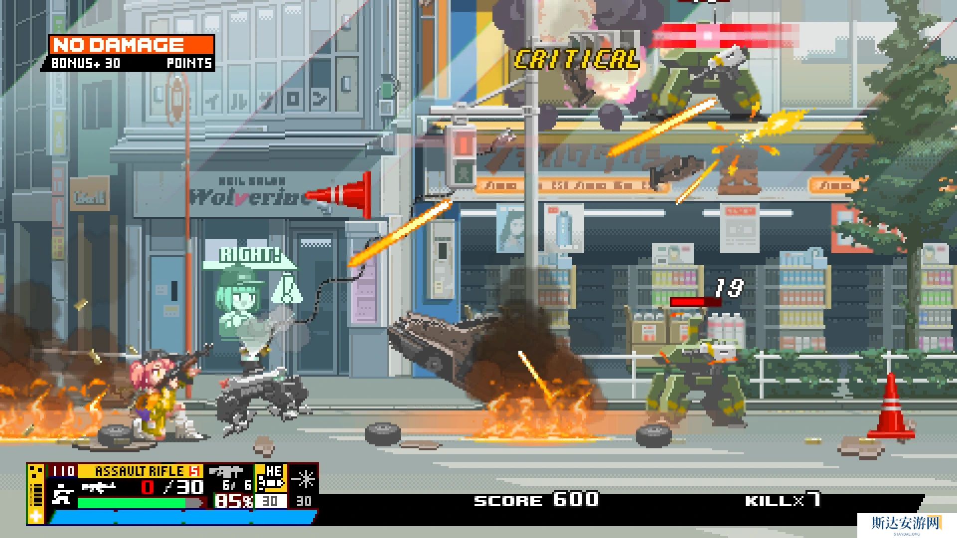《硝基特快》是一款以日本城市为舞台的2D横卷轴枪战动作游戏。玩家可以在游戏中体验像素风活力美少女使用各种热武器进行 360°无死角射击。
