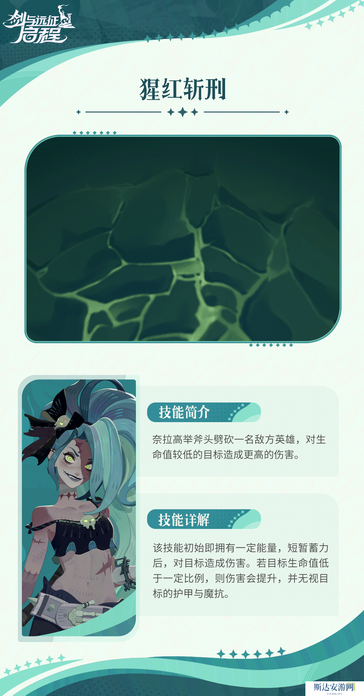 技能效果:当奈拉解锁专属技能冥火焚恨后,每当她通过猩红斩刑击败一名敌人后,一道强大的冲击波便会爆发开来,对范围内所有敌人造成基于被击败目标最大生命值的伤害,同时为友军恢复相应比例的生命值。