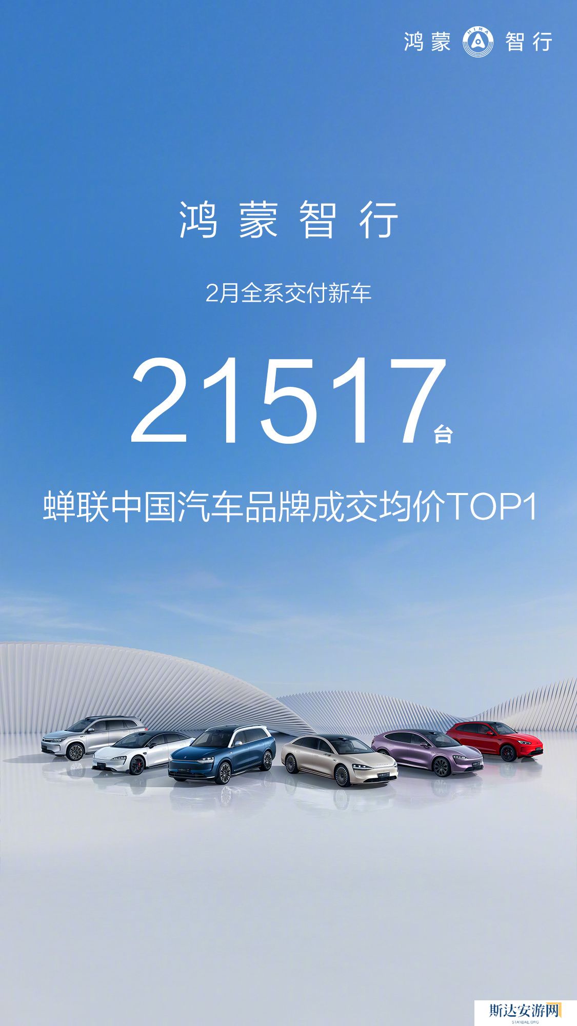 本站 3 月 1 日消息,2025 年 2 月,鸿蒙智行全系交付新车 21517 辆,蝉联中国汽车品牌成交均价 TOP 1。